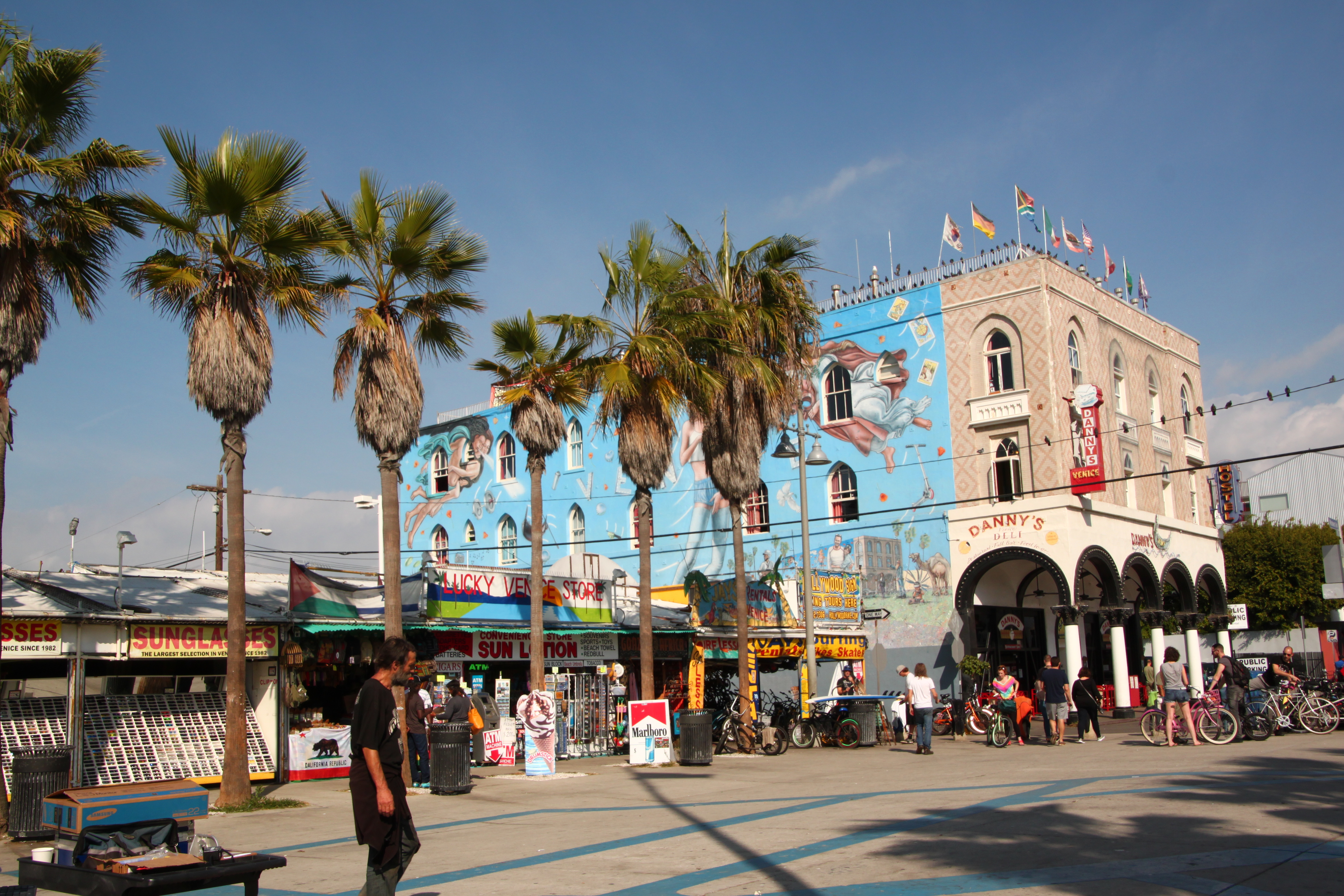 A bike ride along the beach from Santa Monica Pier to Venice Beach is a must. We hired bikes from Seamist Skate and Bike Rentals under the Santa Monica Pier (the cheapest in the area) and set on our way. I managed to fashion my very dangerous maxi skirt into a mini skirt for safer bike riding. Venice Beach was a cool place and allowed for some interesting people watching. It is the outdoor sports paradise, with public basketball courts, squash courts, gym equipment and skate park. There was some real talent on those skateboards (I’m no expert but what they did looked tricky to me) and some incredible acrobatics being performed in the gym section. We ate fish and chips on the beach and soaked in the beachy vibe.